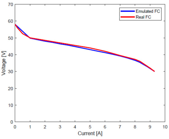 Firstly, the fuel cell emulation was validated by comparing the emulated curve with the real FCS-C300 fuel cell curve provided by Horizon Fuel Cell Technologies. As described previously, the control unit evaluates the current delivered by the power supply through its monitoring port and then, after calculating the corresponding voltage, sends a signal to the PS control voltage port. The PS translates this signal and sets the output voltage in accordance to it. Figure 7 shows the comparison between the emulated FC V-I curve and the real FC V-I curve. The real FC curve was obtained from the datasheet of the fuel cell. It can be stated that the two curves are very close; thus, the FC is properly emulated. This test was repeated at least twice at different time periods in order to verify the capability of the system to provide approximately the same FC curve. Repetition of the test showed that the system provides approximately the same FC curve, with a max deviation of around 0.9% in terms of the voltage difference between the test repetitions. However, the max deviation was recorded at low loads, where the V-I curve slope is greater, while for medium–high loads, the difference was reduced to around 0.6%.