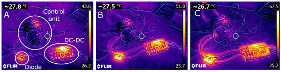 To evaluate the temperatures reached by the components, a thermal analysis test was performed. Since the most-critical elements of the bench are the power converter and the diode, the analysis focused on monitoring their temperatures during different levels of power flow. The tests were conducted with 100, 200 and 300 W flowing through the converter and the diode. The ambient temperature during the thermal analysis was equal to approximately 25 °C. For each level of power, the thermal regime was reached. A thermal camera was used to record the temperatures of the components during the test. The camera adopted wa the FLIR E4 manufactured by Teledyne FLIR (Teledyne FLIR LLC, Wilsonville, OR, USA). Figure 9 shows the images collected with the thermal camera. With 100 W of power flow, the maximum temperatures recorded were about 43.6 °C on the DC-DC converter and about 37–38 °C on the diode. With 200 W of power flow, the maximum temperatures reached 51 °C both on the converter and the diode. As expected, the maximum temperatures were recorded in the case of 300 W of power flow and corresponded to approximately 67.5 °C. This temperature was recorded on the diode, while a slightly lower temperature of about 60 °C was observed on the power converter. Moreover, with the increase in the load current, a rise in the wire temperature was noted. However, the temperatures reached during the test were considered acceptable.