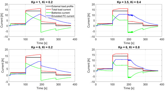Tests were conducted to evaluate the system response to a step load. As described previously, the batteries must handle sudden changes in the external load, while the emulated FC has to follow the low-dynamic component of the power demand. Since the power split is performed by the power converter, the behaviour of the energy sources is determined by the energy management strategy. As described in Section 4, the EMS proposed for this preliminary test is a PI-based strategy. Thus, different parameters of the PI controller determine different time responses of the emulated fuel cell. To highlight this behaviour, the tests to evaluate the system response to a step load were performed with different parameter values of the PI controller. The external load power consumption for this test was determined as follows: from t = 0 s to t = 10 s, the external load was equal to zero; from t = 10.05 s to t = 100 s, the external load power was equal to approximately 50 W; from t = 100.05 s to t = 190 s, it was equal to 330 W; from t = 190.05 s to t = 280 s, it was equal to 50 W; and in the end, from t = 280.05 s to t = 370 s, it was equal to zero. However, the total power requested by the load unit is equal to the external load plus the estimated power requested by the auxiliaries of the FC system; thus, during the tests, it reached a maximum of approximately 390 W. This load profile is not realistic, but the aim of this test is to highlight the system behaviour in response to a high and sudden load variation rather than to a realistic load profile. The value of 330 W was chosen since it corresponded to the maximum power requested by the external load in the scaled reference powertrain. Figure 10 shows the system response to a step load with different PI gain parameters. The external load profile means the current requested without considering the FC auxiliaries’ current absorptions, while total load current means the overall current requested by the load unit during the test; thus, it comprises both the external load and the FC system auxiliaries’ absorptions. It can be stated that the power fluctuations of the emulated FC can be significantly reduced with proper tuning of the PI controller. On the contrary, if the gains are not properly tuned, the system may not be stable, and this translates into some oscillations in the power output.
