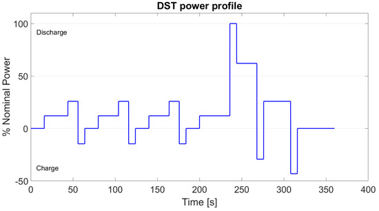 The dynamic stress test (DST) is a widely adopted driving cycle used to evaluate various battery models and state-of-charge (SOC) estimation algorithms [46,47,48]. The DST is defined by a 360 s sequence of power steps with seven discrete power levels, as shown in Figure 11. Even if this cycle is mainly used for testing batteries, the authors deem it useful for evaluating the emulated powertrain behaviour and also because of the lack of standardized drive cycles for agricultural tractors. The power sequence is composed of discharge and charge phases; thus, the load unit alternated between sequences in which it required power and sequences in which it provided power (as happens during regenerative braking). The results of the DST are shown in Figure 12. For the test, the PI gains adopted were derived from the step-load system response; thus, the configuration with Kp = 1 and Ki = 0.2 was adopted. It can be stated that even if the system was characterized by step-load variations, the emulated fuel cell did not have sudden changes in the power output. At the end of the test the FC was still providing power since the integral part of the PI controller was still discharging.