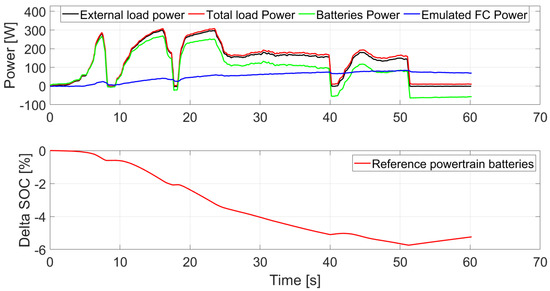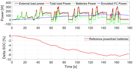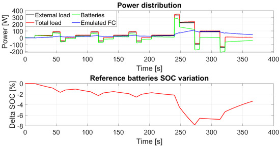 Figure 12 also shows the reference batteries’ SOC variation. Additionally, in this case, the total load power corresponds to the sum of the external load and the FC system auxiliaries’ power absorptions. This plot was obtained by considering the scaling of the nominal capacity of the reference powertrain. At the beginning of the test, the batteries discharged since the FC requires a certain time to reach the average power demand. Then, the FC starts recharging the batteries during low external power requests. Actually, the proposed PI-based strategy behaves similarly to a charge-sustaining strategy with a slow time response.