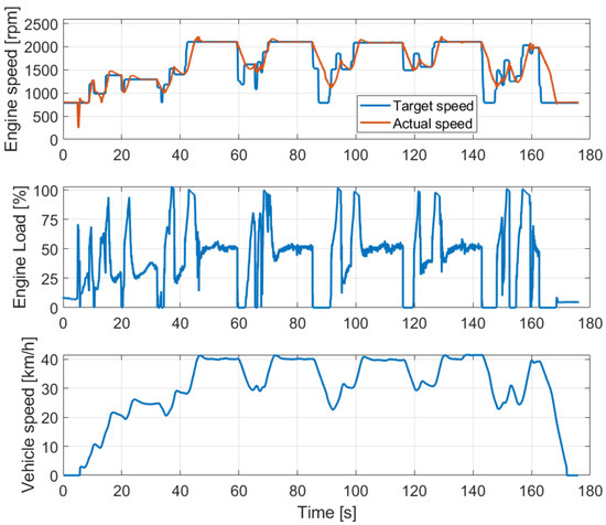 As for the handling of trailers, two different conditions were considered: a 0–40 km/h acceleration test with a fully loaded trailer (6000 kg mass) and road transportation of an empty trailer. Figure 13 shows the experimental data for the road transportation test of an empty trailer, while Figure 14 shows the experimental data for the 0–40 km/h acceleration test with a fully loaded trailer. Both tests were conducted on a flat, paved road. At the beginning of both tests, the vehicle was in neutral gear. As for the empty trailer test, the acceleration phase was characterized by three gear changes around 6, 11 and 21 s. Additionally, in the case of the test with the fully loaded trailer, the same three gear ratios were used, with shifting at approximately 4, 10 and 18 s during the acceleration phase. During both tests, the PTO was disengaged. It can be stated that the proposed work scenarios were characterized by sudden variations in the engine load due to acceleration, deceleration and gearshifting phases. Thus, the authors deemed that these profiles were suitable for testing the system in order to evaluate the capacity of the load unit to reproduce the power demand of the work cycles and to analyse the behaviour of the EMS in terms of the power split between the emulated FC and the batteries.