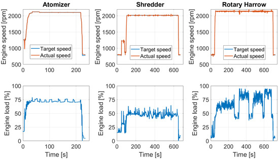 To perform on-field operations such as soil tillage or the application of fertilizer, implements are attached to the tractor and powered by the engine through the PTO. Three different tasks involving the use of PTO implements were considered: the use of an atomizer, the use of a shredder and the use of a rotary harrow. Figure 17 shows the experimental data recorded on the traditional tractor for the three proposed tasks. The rotary harrow implement was the one with the highest peaks in the power demand, while the shredder was the one that required the lowest power, showing an average engine load of around 50%.