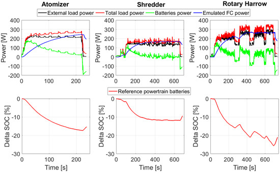 As in the previous tests, the power profiles were extrapolated from the engine load and the engine speed knowing its characteristic curves. Then, the power profiles were scaled to the power level of the test bench and were performed. The results are shown in Figure 18. Analysing the results, some considerations can be made. Firstly, with the proposed EMS, the high time of response of the FC caused an initial drop in the SOC of the reference powertrain batteries, which was more than 10% for all the tested scenarios. Thus, future work should deeply investigate the EMS in order to reduce this effect. Secondly, for implements that require very high power, such as the rotary harrow, the FC system cannot provide enough power to satisfy the power request during the most-intense work conditions. This can be attributed to the efficiency of the DC-DC and to the power absorbed by the auxiliaries of the FC system, which can reduce the effective power that the FC delivers to satisfy the external load demand. However, in this paper, the power absorbed by the auxiliaries was estimated according to studies available in the literature; thus, a deeper investigation with further experimental data should be conducted.