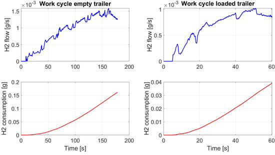 Estimated hydrogen flow and total consumption for the FCS-C300 during the handling of a trailer work scenarios.