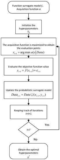 where is a black-box function. For instance, the known data are where is the accuracy under the test set of the model trained by hyperparameter , and the current evaluated data are denoted as . This could estimate the optimal value of the black-box function in a small known small data set. In the following sections, the probabilistic surrogate model was adopted to fit the black-box function. Aside from that, the optimal value of the black-box function was iterated by the acquisition function in accordance with the known .