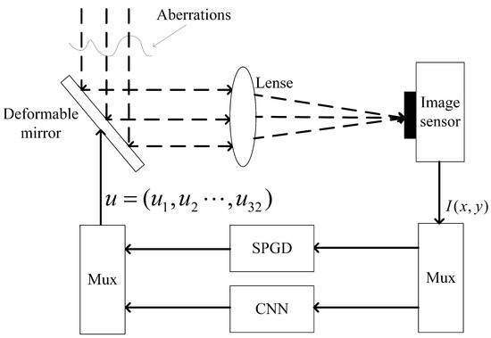 Adaptive optics systems use control algorithms to correct for aberrations and measure phases in real time with a wavefront sensor to ensure the optical system is immune to interference and adaptable to the environment; therefore, they have been widely used in laser communications, femtosecond lasers, and astronomical observations [1,2,3,4,5,6,7]. Currently, Shack–Hartmann wavefront sensors are the most effective and popular wavefront sensors [8]. However, unfavorable conditions, such as a weak target light source, an uneven light intensity distribution, and a high large light amplitude, result in a threshold value that is too low for the wavefront to interpret an accurate, leading below which the wavefront sensor extracts the effective signal leads to a significant reduction in the measurement accuracy that affects the dynamic correction performance of adaptive optics [9,10]. In contrast, a wavefront sensorless system has a higher accuracy than systems with wavefront sensors when the target light energy is weak, and their simple construction makes adaptive optics more affordable than other solutions under certain circumstances [11].