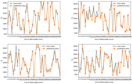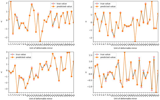 Figure 6 shows the comparison between the predicted value of 39 units of the deformable mirror as predicted by the hyperparameter- optimized convolutional neural network and the truevalue. The data on the horizontal axis represented the number of units of the deformable mirror, and the vertical axis represented the true value and predicted value of each unit of the deformable mirror. The overall prediction performance was good, and the error between the true value and predicted value of each unit of the deformable mirror was small. It showed that the model in this paper could accurately extract features from random distortion images and obtain random distortion correction data. The experiment in this paper was carried out on an GTX1070 graphics card, and it took approximately 0.32 ms to execute the model trained in this paper, and the frequency reached 3 kHZ.