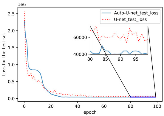 Figure 5 shows the testing dataset comparison between the hyperparameter-optimized convolutional neural network Auto-U-net and the artificially designed convolutional neural network U-Net. As revealed by the above analysis, the testing set accuracy of the optimized network was significantly higher than that of the U-net network. Moreover, the root-mean-square-error (RMSE) of the predicted voltage of the algorithm in this paper was 41,246. The RMSE of the U-net network predicted voltage was 55,546, and the accuracy was increased by more than 26%. It demonstrated that the hyperparameter-optimized convolutional network outperformed the manually designed convolutional neural network in terms of accuracy.