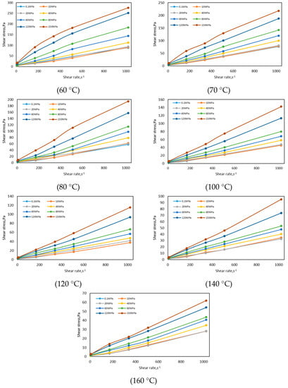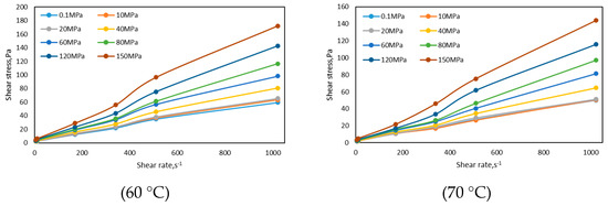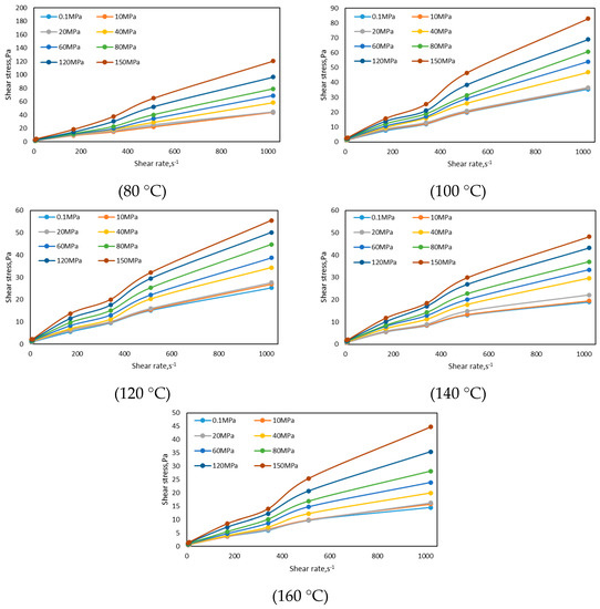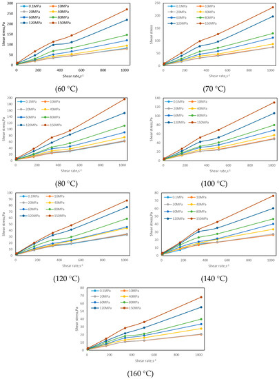 | Temperature, °C | Shear Rate, 1/s | Pressure, MPa | |||||||