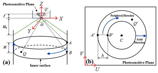 In Figure 2a, A, B and Q are points on the inner surface of the hole with AB parallel to the axis of the hole, H represents the axial distance between two points of A and B, f is the focal length of the endoscope, is its angle of view, and H0 is its minimum depth of field. In Figure 2b, A′, B′ and Q′ represent the image points corresponding to A, B and Q points. C denotes the projection of the lens center in the phase plane and can also be understood as the image center. h refers to pixel ring width that corresponds to axial distance H on the inner surface in the phase plane. The blue arrows indicate circumferential direction and axial direction, respectively.