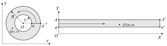 Since points at the same height on the inner surface of the hole should have identical N-axis coordinates after correction, the pixel ring with C (uc, vc) as its center in the endoscopic image should be corrected to a horizontal line in the N-M coordinate system. Assuming that the outer radius of the annulus is R and the inner radius is r, a ray starting from point O along the positive X-axis intersects with the inner circle at point a and with the outer circle at point A when the center of the known endoscopic image is C (uc, vc). The circular ring is bisected along line segment OA, with ray OA serving as the Y-axis of the unfolding coordinate system. Counterclockwise unfolding of the circular ring yields the X-axis of unfolded coordinates. Figure 4 illustrates how circumferential correction for endoscopic images works.
