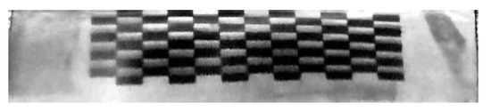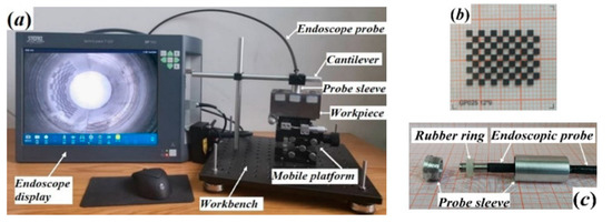 The image acquisition setup is depicted in Figure 6a. The hole part should be placed on a workbench that can move along the X, Y and Z direction. The endoscope probe should be fixed downward at the front end of the workbench cantilever. The diameter of the hole is 20 mm, and its depth is 80 mm. The calibration paper close to the inner wall of the hole serves as the shooting target. This paper has transparent standard paper with 9 × 12 black squares measuring 1.5 mm × 1.5 mm (as shown in Figure 6b). To ensure that the main optical axis of the lens always coincides with the hole axis, a self-made endoscopic probe sleeve with an external diameter of 19.5 mm is used to fix its position, as shown in Figure 6c.