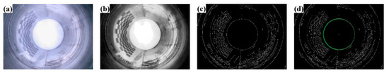 Before correction, the collected images of the inner surface of the holes need to undergo preprocessing [21], which includes gray conversion, median filtering and Laplacian sharpening. The gray conversion process uses a weighted average method that considers human sensitivity to three-channel colors. Each component is assigned a weight of 0.299, 0.587 and 0.114, respectively, to derive the corresponding gray value. Median filtering involves using the median gray value of a 3 × 3 neighborhood surrounding each pixel as its own gray value, while Laplacian sharpening utilizes second-order differentiation in eight directions within a 3 × 3 neighborhood to reflect abrupt changes in pixel grayscale values. Image sharpening can be achieved by adding this result to the original pixel. The results are shown in Figure 7b.