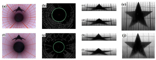 To verify the applicability of the correction method and analyze the error source further, experiments were conducted using φ12 mm and φ28 mm holes as examples. Internal surface defects were simulated by pentagonal stars with known sizes. Endoscopic images were obtained and corrected under the same conditions and methods. The correction process and results are shown in Figure 11. Where (a)–(e) represent 12 mm holes, and (f)–(j) represent 28 mm holes; (a) and (f) show the original images, (b) and (g) display image center detection results, (c) and (h) display the circumferential correction results, (d) and (i) represent the axial correction results, and (e) and (j) represent the final correction results. The image centers of 12 mm is (305, 386) and the 28 mm is (318, 378).