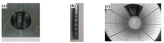In the third group, a real φ18 mm hole inner surface was photographed. Firstly, the side wall of the hole was cut using wire cutting, and then round spots were painted on the inner surface of the cut hole using a carbon pen to simulate rust spots caused by oxidation. Before shooting, the cut side wall was put back in its original position and aligned properly. A calibration paper with a 10 30 mm hollow area was placed inside the hole. The experimental process and shooting results are shown in Figure 14. Specifically, (a) shows a top view outside the hole, (b) shows the cut part of the hole wall with simulated defects, and (c) displays endoscope shooting results.