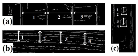 It can be observed that the correction effect is generally good. In Figure 15a, the grooves are parallel to each other and perpendicular to the bottom edge of the image. In Figure 15b, the light and dark bands of the thread are clearly distinguished and basically parallel in an oblique distribution. The position distribution of three simulated rust spots in Figure 15c is consistent with the reality. The edge detection algorithm is used to extract the image contour, measure the pixel distance, and calculate the inner surface size of the hole. The results of edge detection and measurement positions are shown in Figure 16, while measured values compared with true values are presented in Table 6.