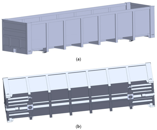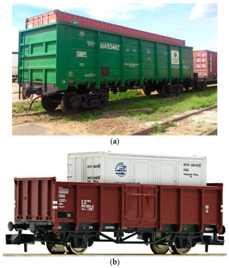 Containers in (a) a 1520 mm gauge open wagon, Reprinted with permission from Ref. [1]. 2023, Rail.insider; (b) a 1425 mm gauge open wagon, Reprinted with permission from Ref. [2]. 2023, EURO TRAIN HOBBY.