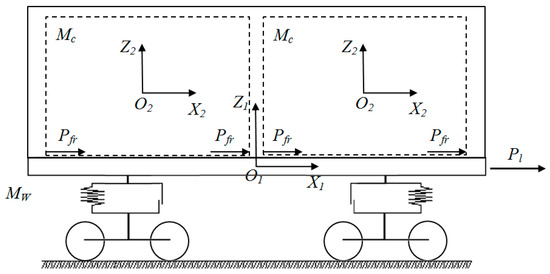 where is the weight of the open wagon loaded with containers; is the weight of the bearing structure of the open wagon, loaded with containers; is the moment of inertia of the open wagon loaded with containers relative to the longitudinal axis; and , , and are the coordinates corresponding to longitudinal, angular around the transverse axis, and vertical displacements of the open wagon loaded with containers, respectively.