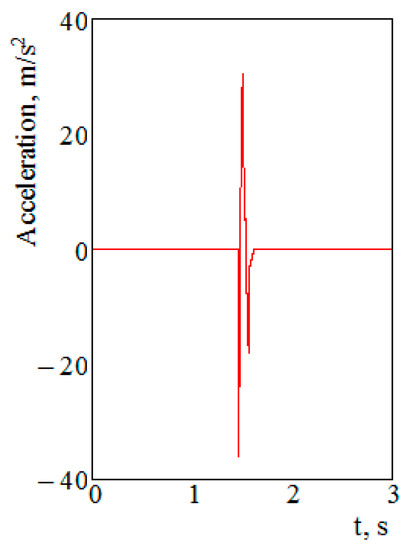 The initial conditions were taken equal to zero [27,28,29]. The results of the calculation showed that the maximum accelerations acting on the constrainer were about 34 m/s2, and those on the open wagon—about 36 m/s2 (Figure 3). The resulting acceleration value can be explained by the fact that the container was not fastened in the body and had its own degree of freedom. This acceleration value is consistent with that presented in the research by Prof. Bogomaz [16]. However, this concerned the longitudinal dynamics of the flat wagon loaded with tank containers. Moreover, his calculation included the displacements of the tank containers due to the gaps between the fittings and the fitting stops.