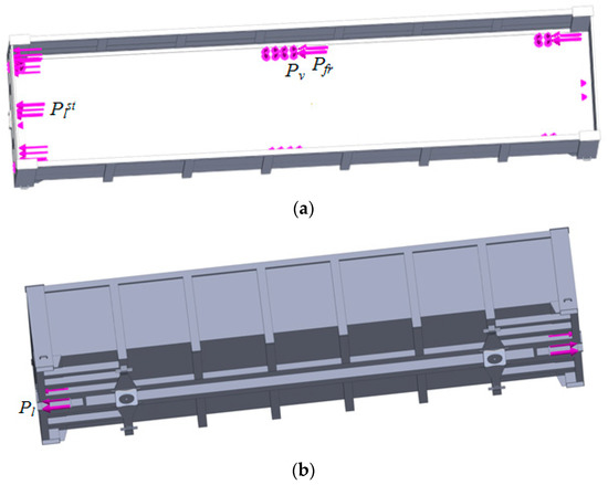 The vertical load Pv was applied to the wagon bottom through the plates, the geometry of which was identical to the geometry of the container fittings. It was taken into account that the bearing structure of the open wagon was loaded with four 1CC containers. In this case, the total value of the vertical load Pv from one container to four plates was taken equal to 240 kN, which corresponded to the gross weight of one container. The load was applied to the entire surface of the plates. In these zones, the longitudinal frictional forces Pfr, which emerged due to the displacement of the container relative to the floor, were taken into account. The value of these forces per container was taken equal to 94.2 kN, and the “steel–steel” friction coefficient was 0.4.