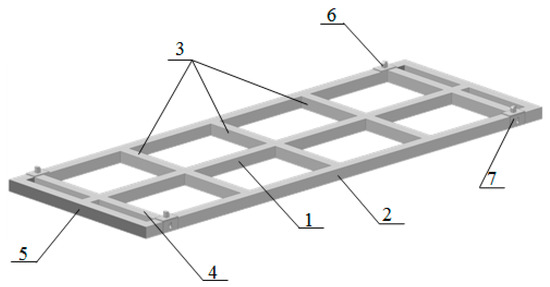 The authors have proposed a detachable module design for fastening containers to the open wagon body (Figure 8). The module includes central beam 1, side beams 2, transverse beams 3, end beams 4, and telescopic cantilever element 5. Containers are fastened with fitting stops 6 to the module, and the module is fastened to the wagon body with fittings 7.