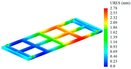 The maximum displacements were recorded in the longitudinal beams of the detachable module and they amounted to 2.78 mm (Figure 19).