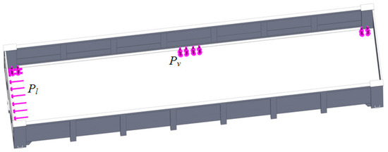 The strength of the bearing structure of the open wagon loaded with containers was calculated using the new fastening diagram. The design diagram of the open wagon is shown in Figure 20. It was taken into account that the vertical load Pv acted on the open wagon body and was transferred to it through the module fittings. This load was taken to be equal to 24 kN and evenly distributed over four plates, which simulated the zone on the floor on which the module rested in the open wagon. Also, the longitudinal load Pl, caused by the forces of inertia, was applied to the end wall in the direction of the movement. This load was determined taking into account the acceleration obtained by means of mathematical model (2) and applied to the end wall through the plate and simulated the zone of interaction between the module and the wall.