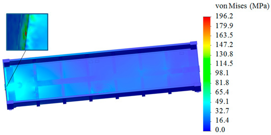 When compiling a finite-element model of the module, spatial tetrahedrons were used. The mesh was built taking into account the appropriate compaction in the zones of rounding and interfaces of the structural elements of the module. The number of elements of the mesh was determined with the graphic-analytical method. In this case, the mesh was formed with 46,828 elements. The number of nodes was 15,305. The maximum size of the element was 60 mm, the minimum—12 mm. The model was fastened in the areas of support on the fitting stops placed in the open wagon body. Steel 09G2S was used as a construction material, which is typical in wagon building for the manufacture of bearing structures of vehicles. The results of the calculation showed that the maximum stresses occurred in the zones of fittings and were 176.1 MPa (Figure 17 and Figure 18), i.e., in the zones where the detachable module was fixed. It is important to say that these stresses did not exceed permissible values.