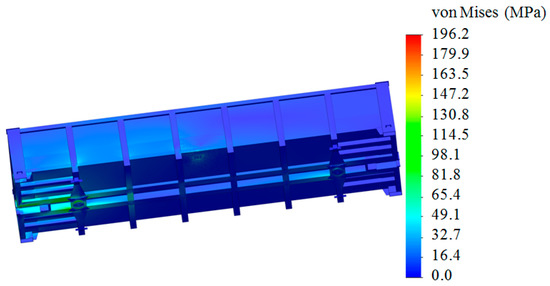 Tetrahedrons were used in the finite-element model. The number of nodes was 786,565, and the number of elements—2,410,633. The maximum size of the element was 25 mm, the minimum—5 mm. The results of the calculation are given in Figure 21, Figure 22 and Figure 23. The maximum stresses occurred in the lower part of the end wall and they amounted to 196.2 MPa (Figure 20 and Figure 21), which did not exceed permissible values.