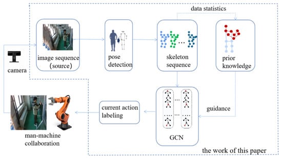Figure 2 shows the system overview of the method proposed in this paper. For the sequence of worker motion images captured using the camera, firstly, the skeleton of the human body is extracted using the pose detection approach in [30]. Secondly, statistical methods are used to extract the skeleton prior knowledge of different actions. Furthermore, combining this prior knowledge, a GCN network guided by prior knowledge is designed and trained. Finally, the network is used to identify the actions of workers corresponding to the captured image sequences online, providing guidance for robot and human collaborative work.