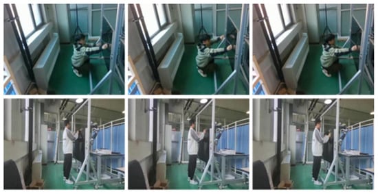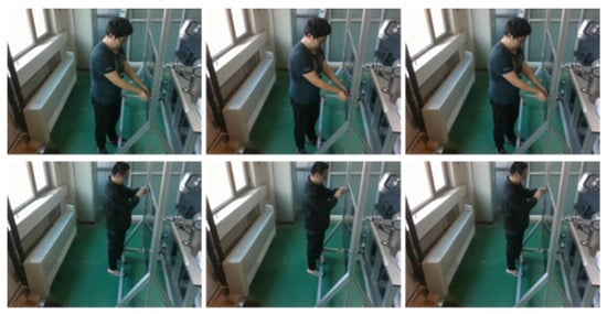 There are four main types of actions: ‘pendulum’ (Figure 4), ‘stay wire’ (Figure 5), ‘threading’ (Figure 6) and ‘tie’ (Figure 7). They correspond to four different processes in the installation process. The purpose of the application algorithms studied in this paper is to correctly distinguish these four types of actions from video, providing guidance for the automatic operation and control of robotic arms that cooperate with humans.