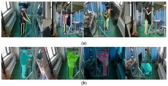 Pre-detection of human skeleton and body area: Figure 9 shows some intermediate results of human skeleton detection and human body area detection using methods provided by Detectron2 [30] from raw image sequences, called the pre-detection step. Then, the human skeleton data are used as inputs for the GCN in this paper and in [36]. The human body area data are used as the inputs of the method in [34].