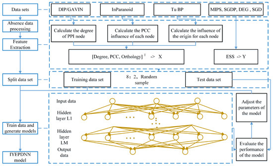 The IYEPDNN processing flow is shown in Figure 1. As the protein–protein interaction (PPI) networks derived from the DIP and GAVIN databases only cover up to 95% of the gene expression data in the InParanoid database. It is necessary to handle absent data to enhance the algorithm’s robustness. To reduce the training complexity of DNN, it is necessary to condense the input data, that is, extract the input features of DNN. Through the yeast protein association relationships in the DIP and GAVIN databases, the PPI network structure is constructed, and then the degree of each node is calculated. The gene influence of each node is calculated by the gene expression database. The homologous influence of each node is calculated from the homologous database. Then, the gene expression, PPI network, and orthology are used as input features of DNN, and the information in the essential protein library is used as output features of DNN. A DNN composed of multiple fully connected layers is used to learn 80% of randomly selected data, and the remaining 20% of data is used as a test set to construct the prediction model of IYEPDNN. The pseudocode of IYEPDNN is illustrated in Algorithm 1.