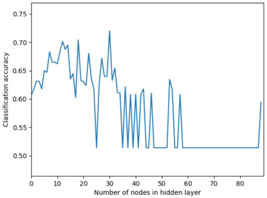 The number of hidden layers and nodes of DNNs has a strong importance on the prediction accuracy of DNNs. When the number of nodes is too small, the DNN training model cannot learn well, which increases the training times and affects the training accuracy. When the number of nodes is too many and the training time increases each time, the DNN training model is prone to an over-fitting phenomenon. According to the characteristics of yeast protein data, data is randomly selected for testing. The relationship between classification error and the number of nodes in the hidden layer is shown in Figure 2.