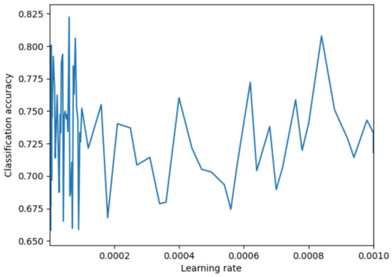 Figure 3 shows the influence on the accuracy of classification with the learning rate decreases. As can be seen from Figure 3, when the learning rate is , the recognition rate has an obvious effect and reaches approximately 82.5%. Therefore, the maximum initial value learning rate of the IYEPDNN model is set to 0.1, which improves the DNN convergence speed. As the learning process progresses, the learning rate decreases and is maintained when the learning rate is , to improve the stability and recognition rate of DNN.