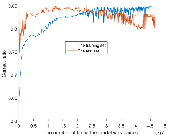 It can be seen from Figure 4 that the data accuracy of the test set first increases and then decreases gradually with the number of times trained. The lowest accuracy is 74.8466% and the highest accuracy is 84.8761%. The accuracy of the training set increases gradually with the number of times trained. The lowest accuracy is 63.2087% and the highest accuracy is 84.9392%. The fitting point is (x = 22,600, y = 84.0881%).