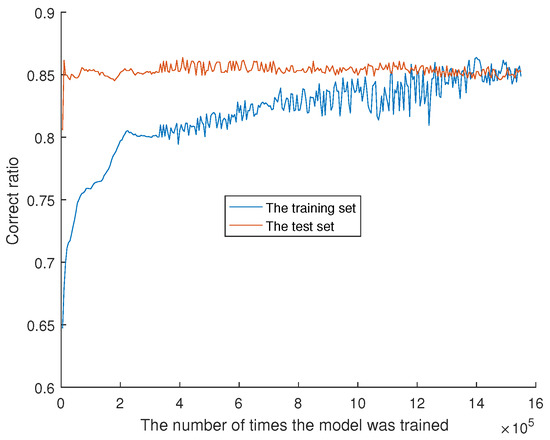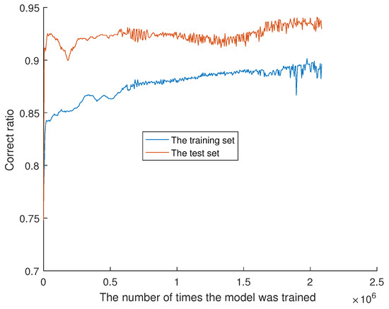It can be seen from Figure 6 that the data accuracy of the test set and training set increases gradually with the number of training iterations. They only intersected at the beginning, and the model training fails to fit. The number of training sessions has reached 2,085,000, yet the accuracy has been a smooth process. It shows that it is difficult to achieve a good fit by increasing the number of training times. Therefore, the fitting point (x = 1,346,160, y = 87.3237%) is the closest point between the test set and the training set with good accuracy. The lowest accuracy of the test set is 74.7908% and the highest accuracy of the test set is 94.0759%. The lowest accuracy of the training set is 77.2088% and the highest accuracy of the training set is 90.1467%.