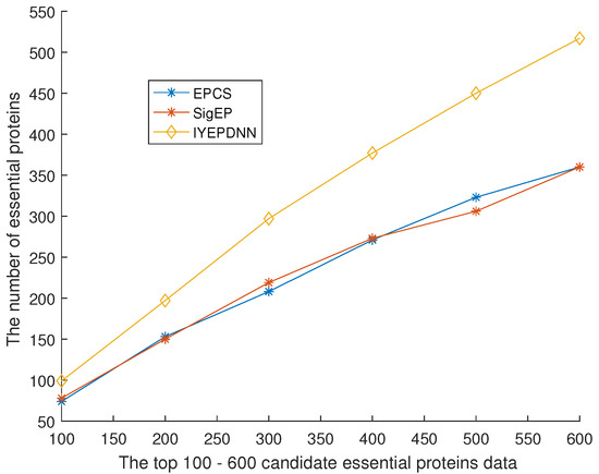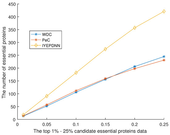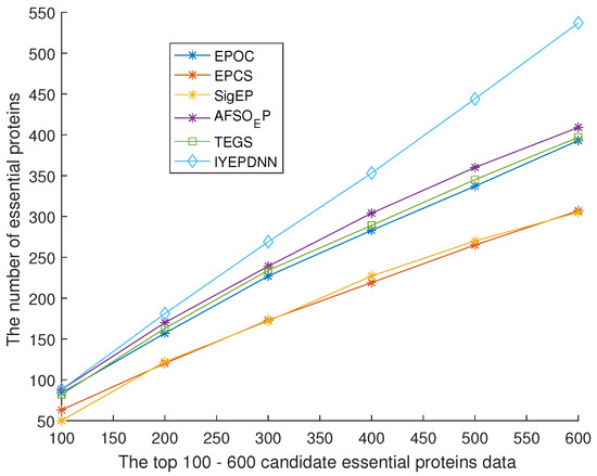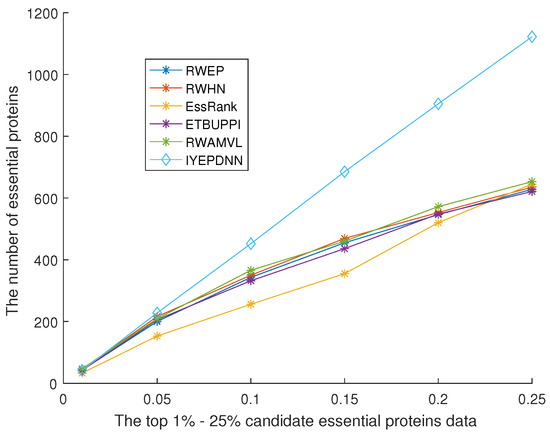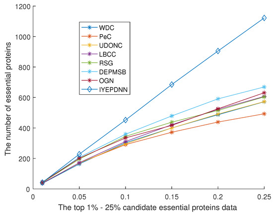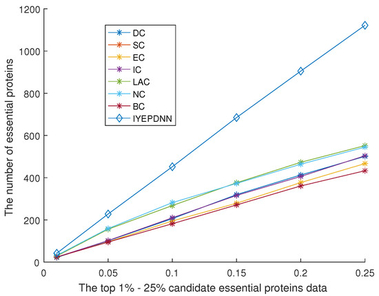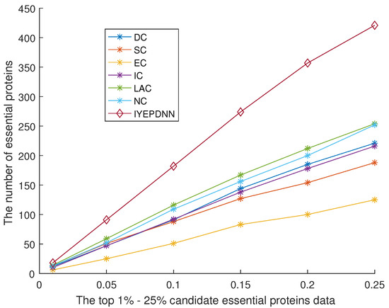 Figure 10 shows the comparison between the IYEPDNN algorithm and PPI network topology-related essential protein recognition algorithms in the DIP dataset. Figure 11 shows the comparison in the GAVIN dataset. With the decrease in the accuracy of candidate essential proteins, the number of essential proteins identified by the PPI network topology correlation algorithm increases linearly. The BC method in Figure 10 is relatively poor, while the LAC and NC methods are effective. Among the first 61 candidate essential proteins, the correct identification accuracy of NC is 32/61 > 50%, while the correct identification accuracy of other PPI network topological correlation algorithms is 24/61 = 39.34%. LAC identified 552 of the 1273 candidate essential proteins, with an accuracy of 552/1273 < 44%. The linear growth rate of PPI network topological correlation algorithms in DIP datasets is lower than (552 − 29)/(1273 − 61) = 43.15%. In Figure 11, the EC method is relatively poor and the LAC method is relatively good. Of the first 19 candidate essential proteins, EC identifies only 6 and LAC identifies 14. EC identifies only 125 of the 464 candidate essential proteins and LAC 254. The linear growth rate of the PPI network topological correlation algorithms in the GAVIN datasets is lower than (254 − 14)/(464 − 19) = 53.69%. The GAVIN dataset is superior to the DIP dataset in basic protein recognition accuracy. It can be seen from Figure 10 and Figure 11 that the number of essential proteins recognized by the IYEPDNN algorithm is much higher than that of the PPI network topological correlation algorithm. In the DIP dataset, the linear growth rate of the IYEPDNN algorithm is (1122 − 42)/(1273 − 61) = 89.10%. The linear growth rate of the IYEPDNN algorithm in the GAVIN dataset is (421 − 18)/(464 − 19) = 91.01%. At the same time, it can be seen that the number of essential proteins identified by the IYEPDNN algorithm is twice that of the PPI network topological correlation algorithm after 10% candidate essential proteins in the DIP dataset. The number of essential proteins identified by the IYEPDNN algorithm is 1.5 times higher than the PPI network topological correlation algorithm after 10% candidate essential proteins in the GAVIN dataset.