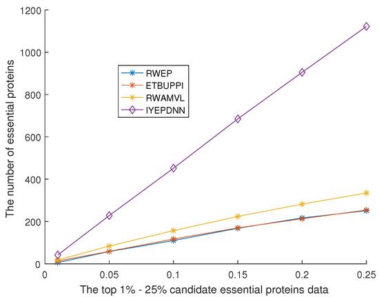 The results in Figure 12, Figure 13, Figure 14 and Figure 15 are better than those in Figure 10 and Figure 11, indicating that the addition of biological characteristics can reduce the false positives and false negatives caused by environmental factors and effectively improve the identification accuracy of essential proteins. The results of Figure 12 and Figure 13 are similar to those in Figure 14 and Figure 15. In particular, the results in Figure 16 show that it is difficult to improve the recognition accuracy by improving the algorithm alone. It is important to search for the relationship between essential and non-essential proteins and the internal correlation between the topology of the PPI network and various biological characteristics. In this paper, the ordinary least squares are used to supplement the missing data, and the deep neural network is used to find the correlation of each feature, which can effectively improve recognition accuracy. Especially in data training, 80% data from known essential proteins and 80% data from non-essential proteins are selected as training data, which can effectively avoid the problem of unbalanced training data.