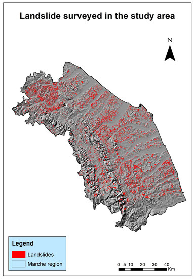 The database when using a statistical method of landslide susceptibility analysis is a fundamental part of this study. In particular, the landslide survey carried out by the Marche Region, through the Central Apennine District Basin Authority, was used in this study. In this context, the Hydrogeological Structure Plan (PAI), is configured as a functional outline of the hydraulic and hydrogeological hazard sector of the General Basin Plan. The file used for the analysis of landslide susceptibility was downloaded directly from the Marche region website and contains all the data on landslide phenomena collected, classified according to type, activity, degree of risk and hazard. The gravitational phenomena selected are the movements of slides, flow, debris flow and mud flow, and 14,297 polygons were identified and used for the analysis (Figure 2). The visualization of the landslides, as well as the analyses were carried out in a GIS environment to obtain spatialized factors, calculating the topographical variables using a digital elevation model at 20 m obtained from the regional technical map.