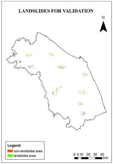 Map of landslide and non-landslide areas chosen for model validation.