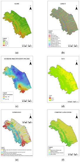 Landslides (https://www.autoritadistrettoac.it/pianificazione/bacino-idrografico/bacini-marchigiani/cartografia-pai-marche accessed on 20 March 2023). Geological map (https://www.regione.marche.it/Regione-Utile/PaesaggioTerritoryUrbanPlanning/Cartography/Repertoire/Cartotageologicaregionale10000 accessed on 20 March 2023). CLC (https://groupware.sinanet.isprambiente.it/uso-copertura-e-consumo-di-suolo/library/copertura-del-suolo/corine-land-cover/clc2018_shapefile accessed on 20 March 2023). NDVI (https://appeears.earthdatacloud.nasa.gov/view/b42ca867-084d-4602-ab01-b8065a148645 accessed on 20 March 2023).