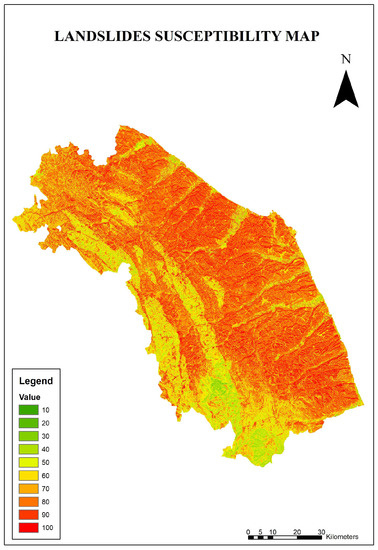 In the present work, 20% of the total landslides used in the calculation of the susceptibility map (training test) were used to validate the susceptibility map (Figure 4).