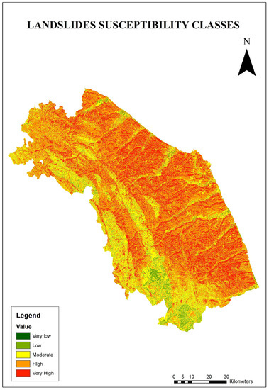 As a result, the territory of this region has quite pronounced hydrogeological instability (Figure 7). Obviously, although the class division performed finds some analogues in the scientific literature on the subject, it is questionable and subject to subjective evaluations that could redefine the qualitative classification of landslide probability. In any case, our assessment shows that only approximately 26% of the territory has a low or moderate probability of generating a landslide, which therefore tends to exclude serious slope instability in those areas (Table 3).