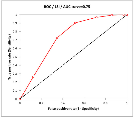 In this context, true negatives represent the probability that a non-slide area is correctly detected by the LSI (Landslide Susceptibility Index); false positives, represent the probability that a landslide area will not be detected in relation to the LSI. On the other hand, true positives represent the probability that a landslide area is correctly classified in relation to LSI, while false negatives represent the probability that a ‘non-landslide area’ is incorrectly classified as a ‘landslide area’ with LSI. ROC curves can be quantitatively summarized using the area under the curve (AUC), measures the model’s ability to discriminate between two classes (e.g., landslide and non-landslide) and provides a scale for assessing the overall quality of a model, the larger the AUC, the better the model’s performance across the entire range of possible threshold values [49]. The area under the curve can take values between 0.5 and 1.0, the larger the area under the curve (i.e., the closer the curve is to the upper left-hand corner of the graph), the greater the discriminating power of the test. To interpret the values of the area under the ROC curve, one can refer to the following classification [50]:
