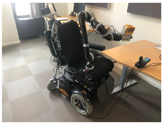The JACO 2 (Kinova, Boisbriand, Quebec, Canada), a 6 degrees of freedom (DoF) robot arm, is attached to a motorized wheelchair and equipped with a RealSense d435 Red Green Blue-Depth (RGBd) camera (Intel, Santa Clara, CA, USA), as shown in Figure 1. The robot arm features an underactuated 2-Finger, 4-DoF gripper designed for grasping tasks. Each finger can be opened and closed with a single command, and the angle of the joint between the two links is dependent on the closure of the fingers and cannot be actuated manually. Control of the arm is facilitated through a fully integrated inductive tongue computer interface (TCI) [14]. The TCI provides semi-autonomous control, allowing the user to give inputs with their tongue via an inductive plate placed on the roof of the mouth, as illustrated in Figure 2.