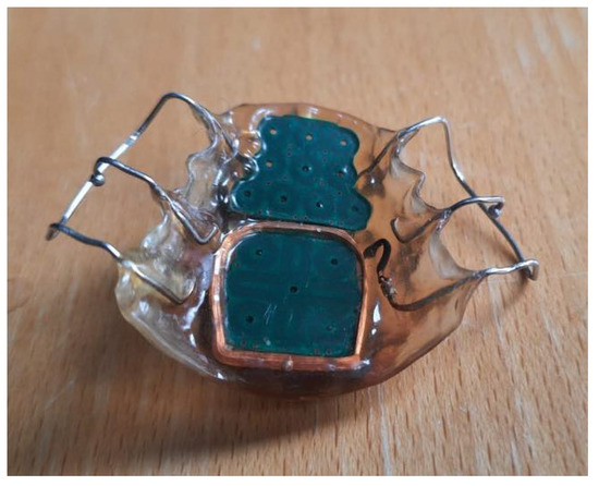 The tongue–computer interface individually fit for each user. Two conductive plates serve as interfaces. One to move the robot arm, the other to act as a menu to switch between manual and semi-autonomous mode. More detail on the TCI can be found in [14].