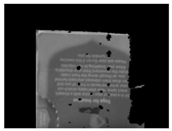 Example of a still noisy grayscale image of an object with the background mostly removed. Here, objects and movements close to the grasped object could cause the boundary of the objects to extend and include some of the background in the boundary estimation.