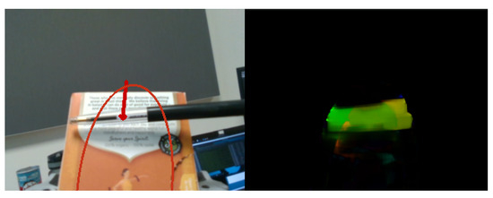 The original image with the approximated image boundaries and slip direction (left) and the HSV representation of the OF direction (right). The hue represents the direction of the flow, and the value represents the magnitude. A typical slip case: the green color indicates an angle of 90°, which in this case shows the object slipping downwards, which is indicated by the arrow on the left image.